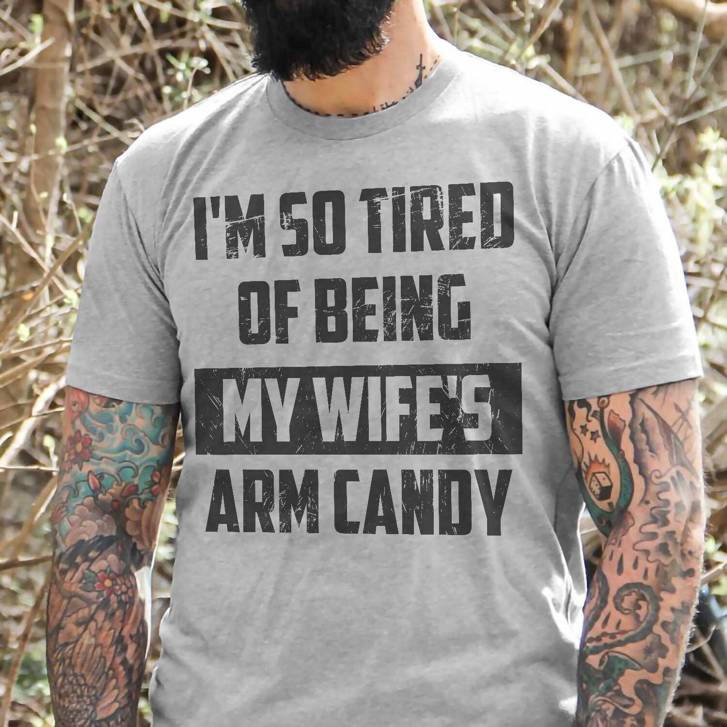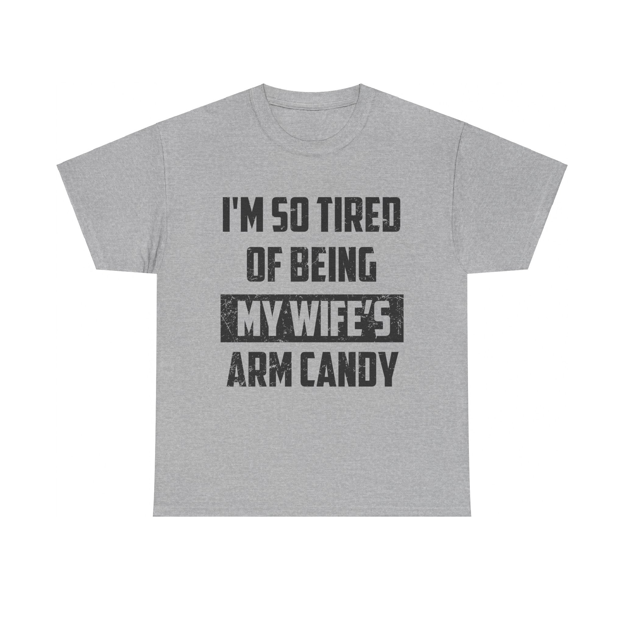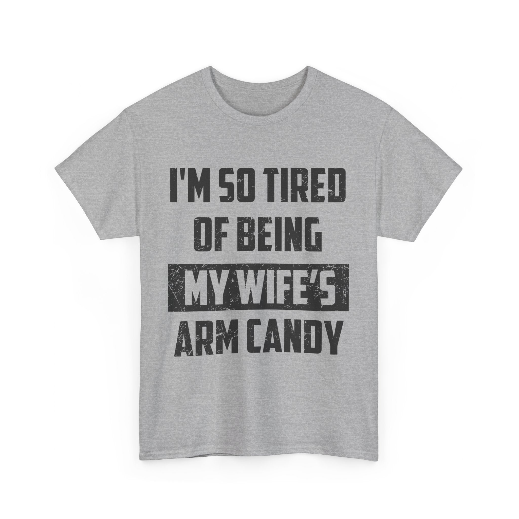 The "I’m So Tired Of Being My Wife’s Arm Candy" Shirt humorously conveys a playful sentiment about being a constant companion. This shirt is perfect for those who appreciate light-hearted self-expression and witty statements.